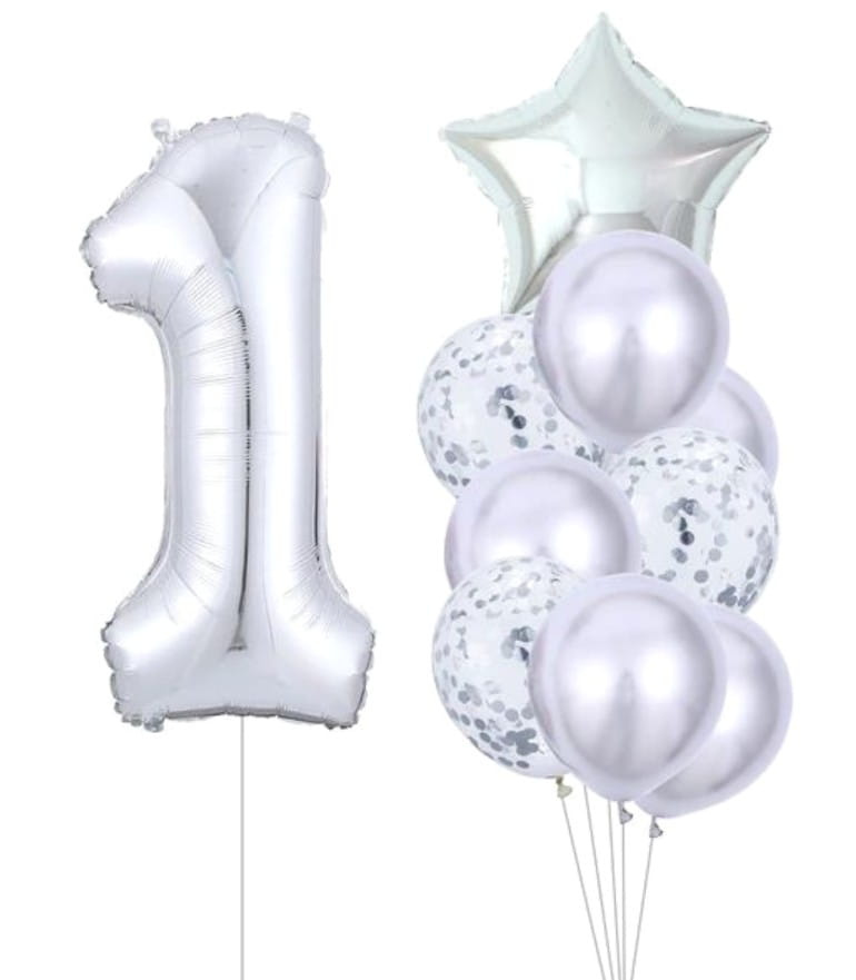 Frumoasele baloane argintii de 10 bucăți pentru zile de naștere din magazinul nostru online, sunt foarte populare. Setul include opt baloane clasice din latex, un produs din folie de acest tip în formă de stea și un al doilea balon din folie care seamănă cu numărul unu.
