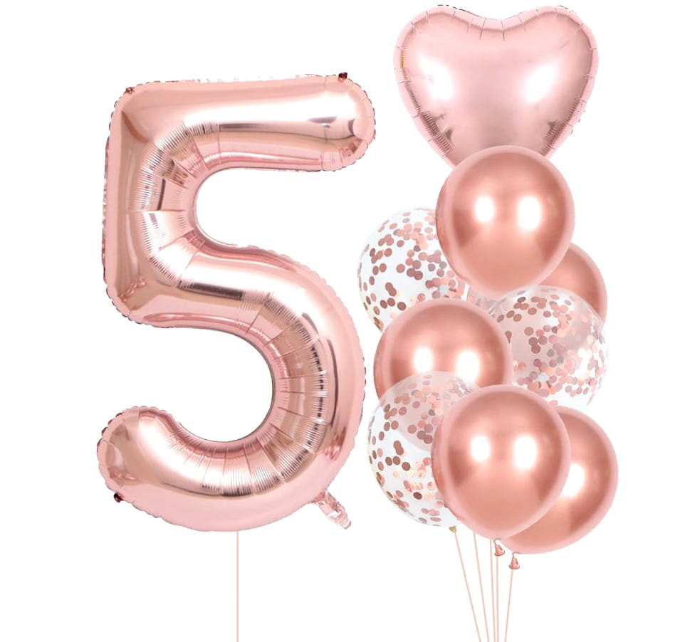Setul include 8 baloane clasice, dintre care 3 sunt transparente și umplute cu confetti rotunde mici. Setul include, de asemenea, un balon inimă drăguț și un balon în forma numărului 5.