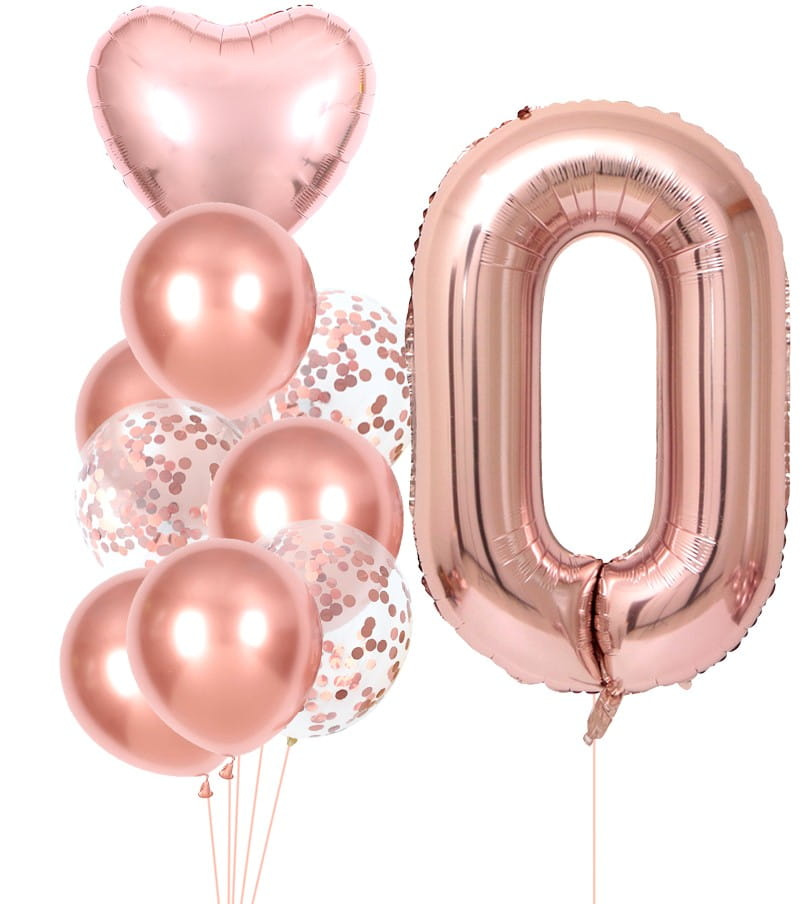 Setul modern de 10 baloane pentru zile de naștere în roz constă, printre altele, dintr-un balon mare din folie în forma numărului 0. Când este umflat, acesta are o înălțime de până la 81 cm. Pe laturi există mici suporturi semicirculare cu găuri, care facilitează fixarea acestuia oriunde.
