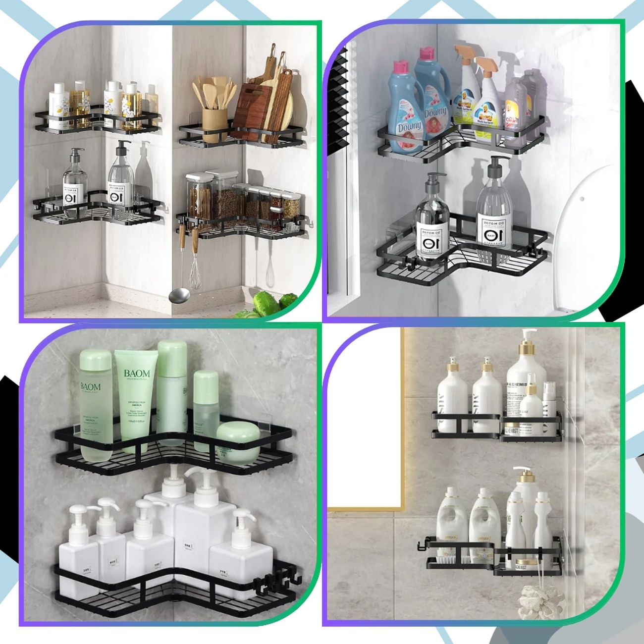 Set de 2 rafturi de colț negre pentru duș, bucătărie, cu instalare fără găurire