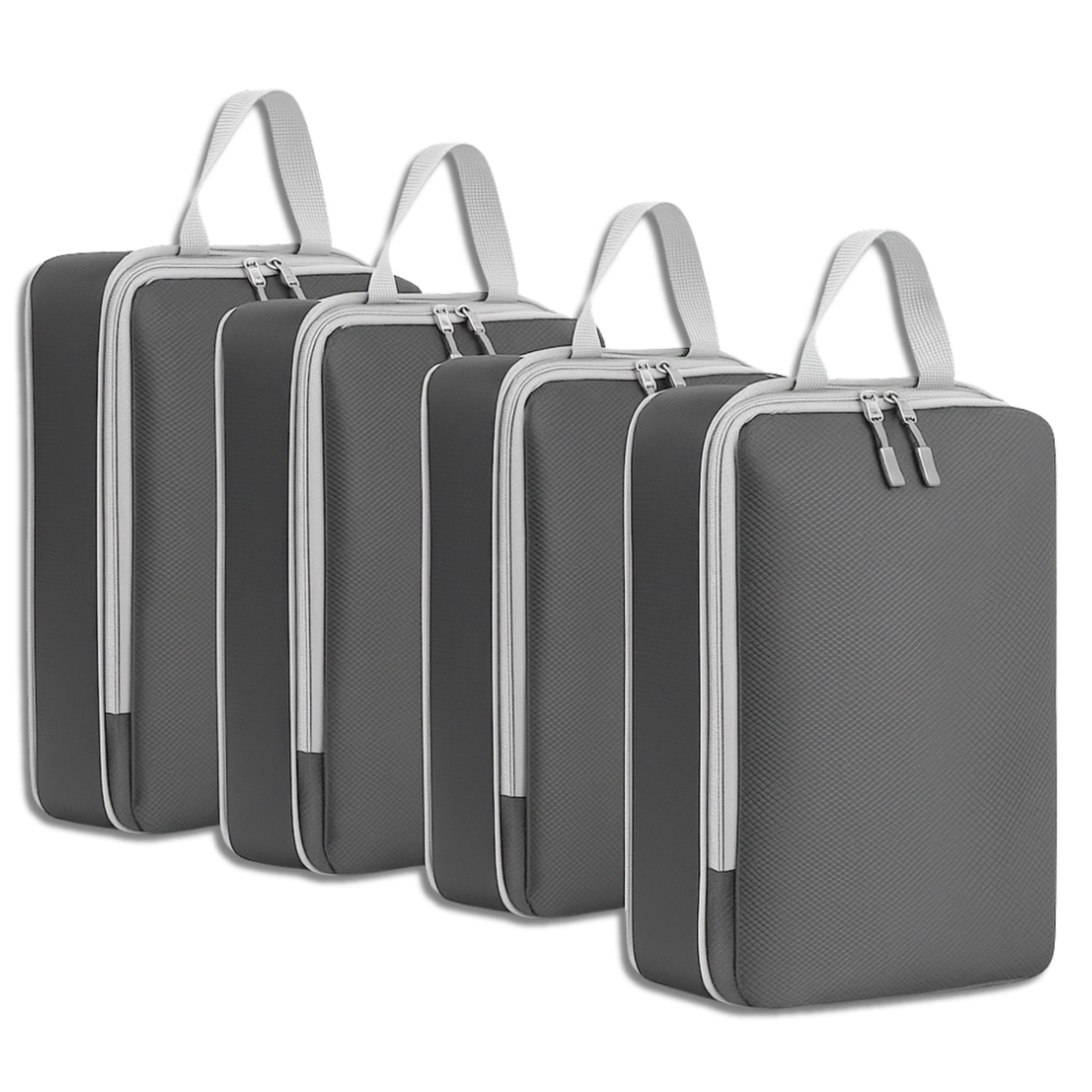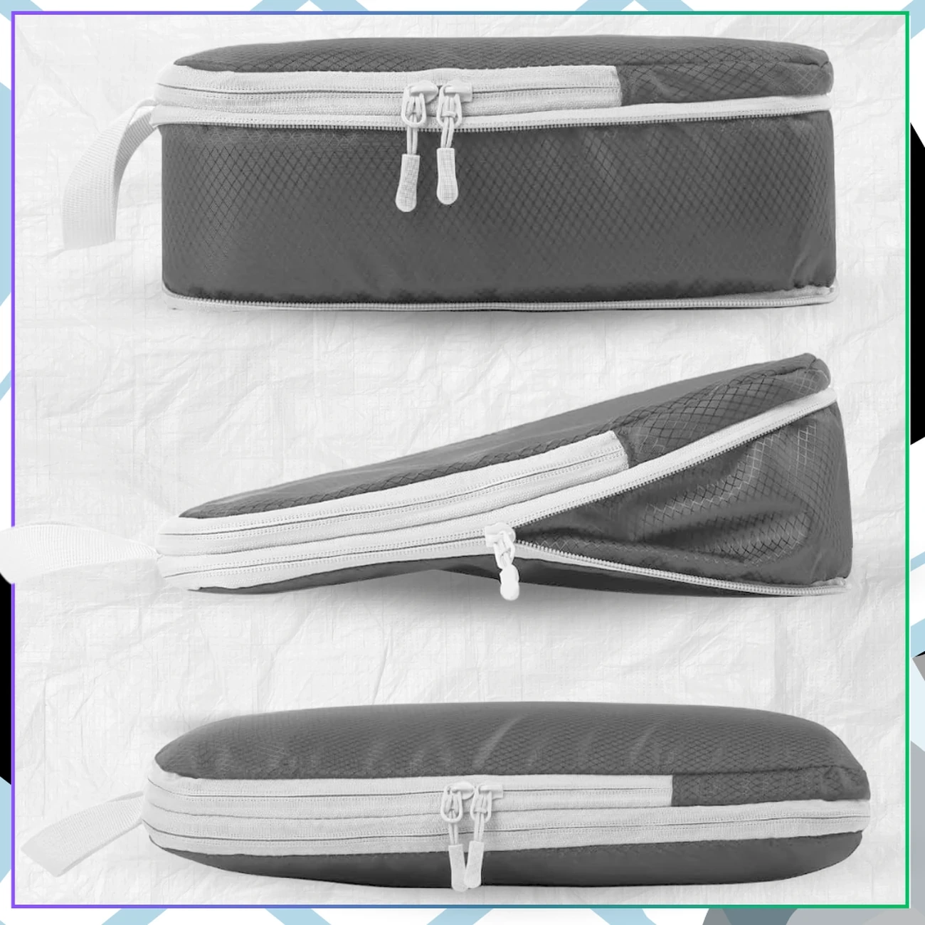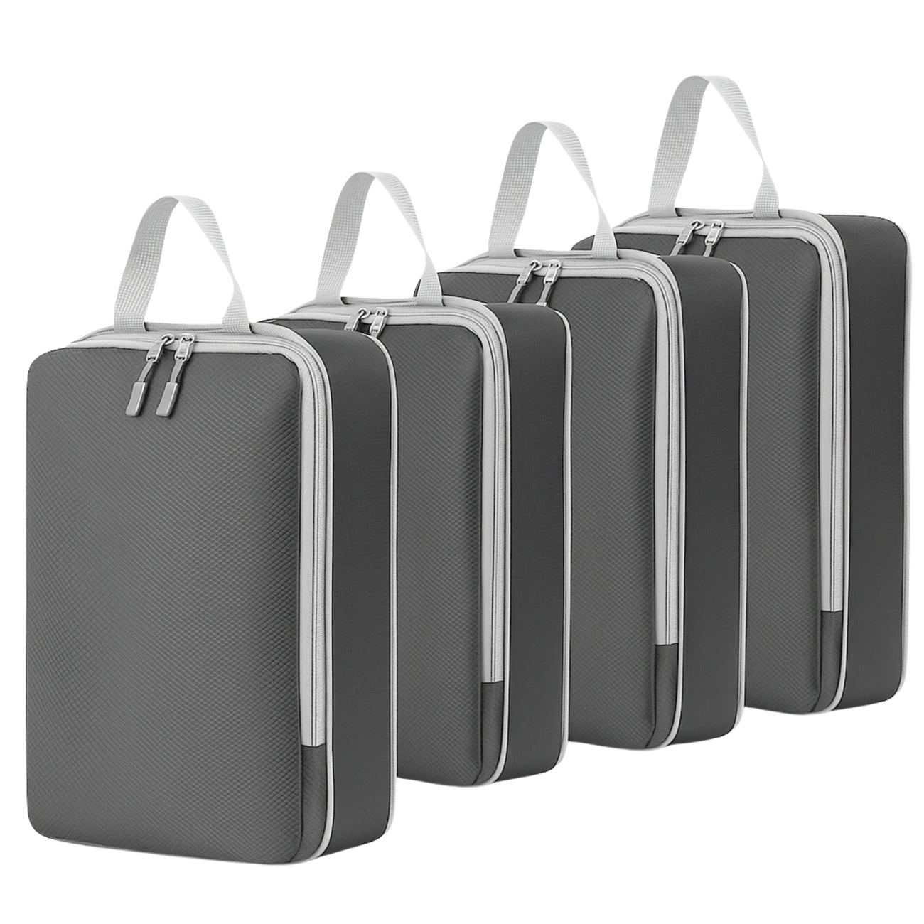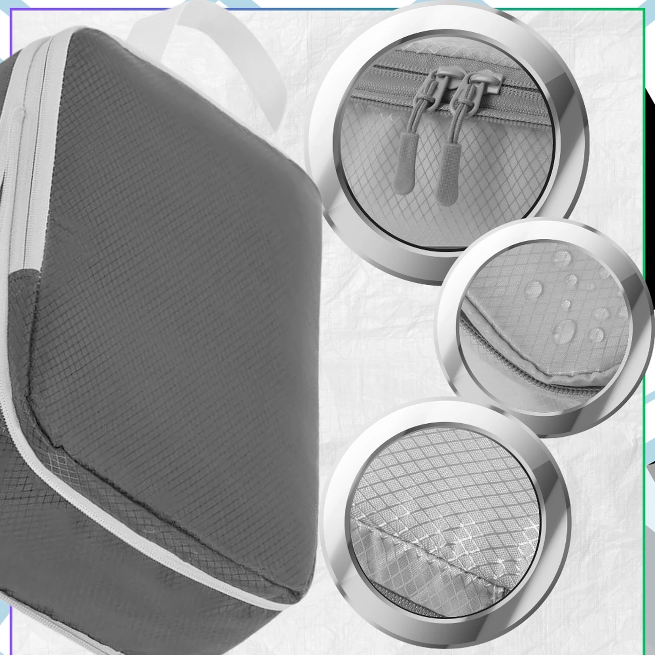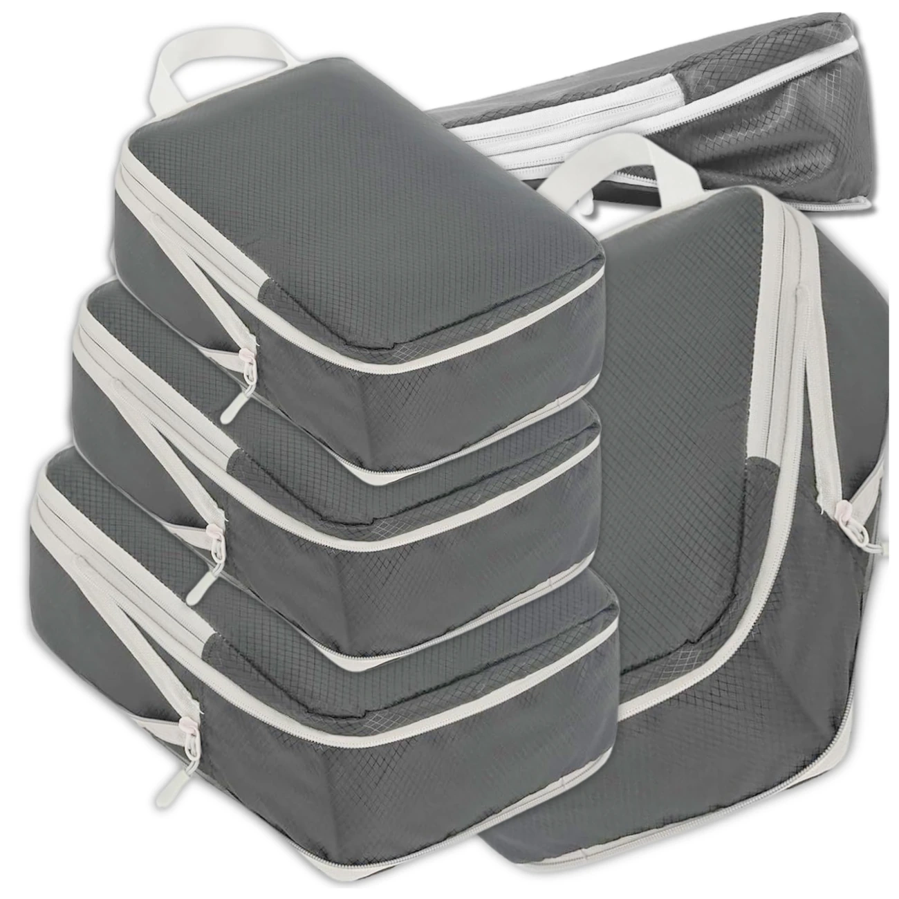 Aceste organizatoare de călătorie cu compresie, într-un gri elegant, sunt soluția perfectă pentru cei care apreciază organizarea perfectă a bagajelor și utilizarea maximă a spațiului din valiză. Produsul este **nou**, fabricat din material sintetic puternic, rezistent la abraziune și șifonare. Datorită posibilității de compresie – de la aprox. 11 cm la aprox. **4 cm** – câștigați spațiu real, suplimentar, în bagaj, fără a fi nevoie de pompă sau saci vidați. Culoarea gri este modernă, minimalistă și versatilă – arată grozav atât vizual, cât și practic, deoarece ascunde murdăria.