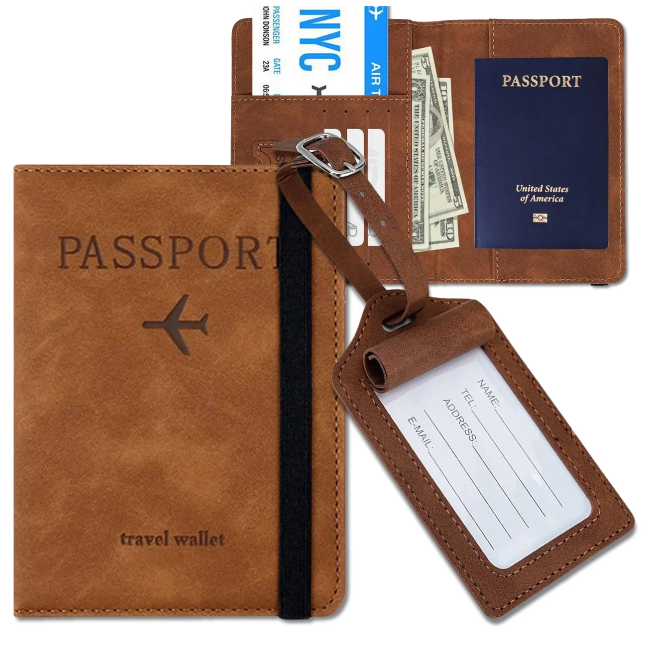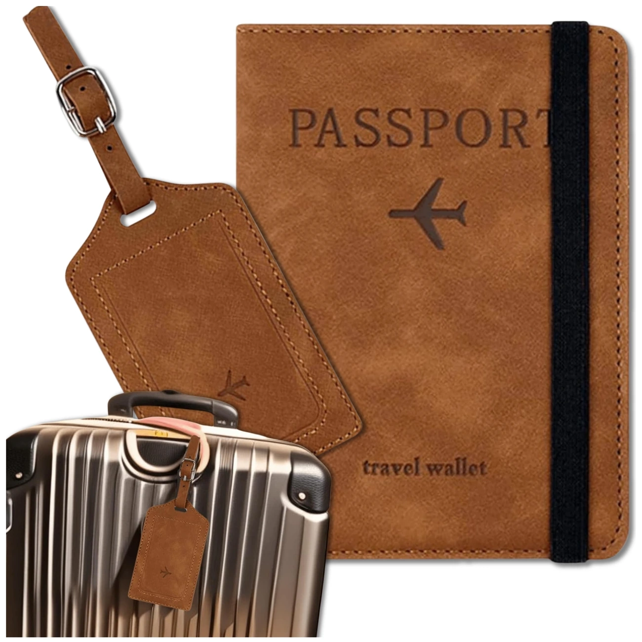Acest set de călătorie maro este perfect pentru călătorii cu avionul, trenul sau autobuzul. Acest accesoriu practic și elegant vă va păstra toate documentele și bagajele importante în siguranță și bine etichetate.