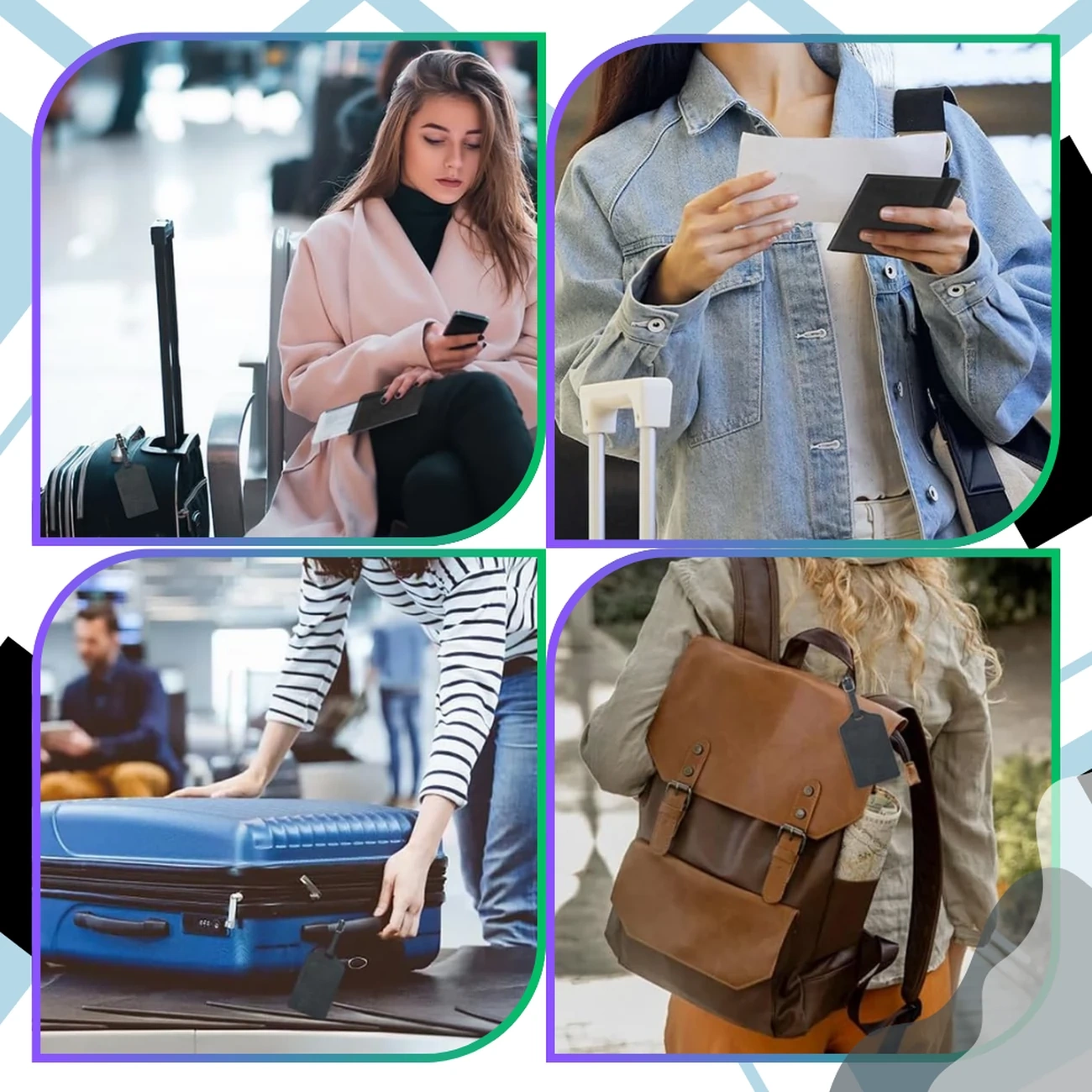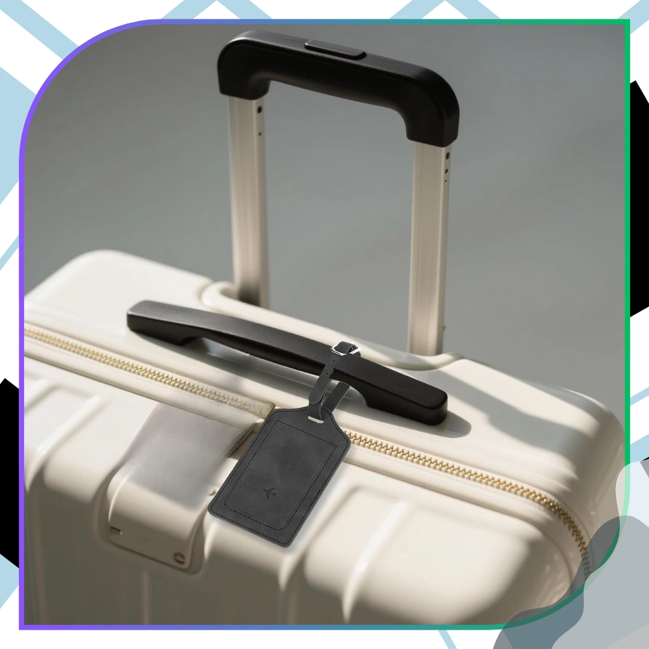 Etichetă de bagaj: 12 × 7 × 0,2 cm, curea de 22 × 1 cm cu cataramă metalică solidă, spațiu pentru datele proprietarului.