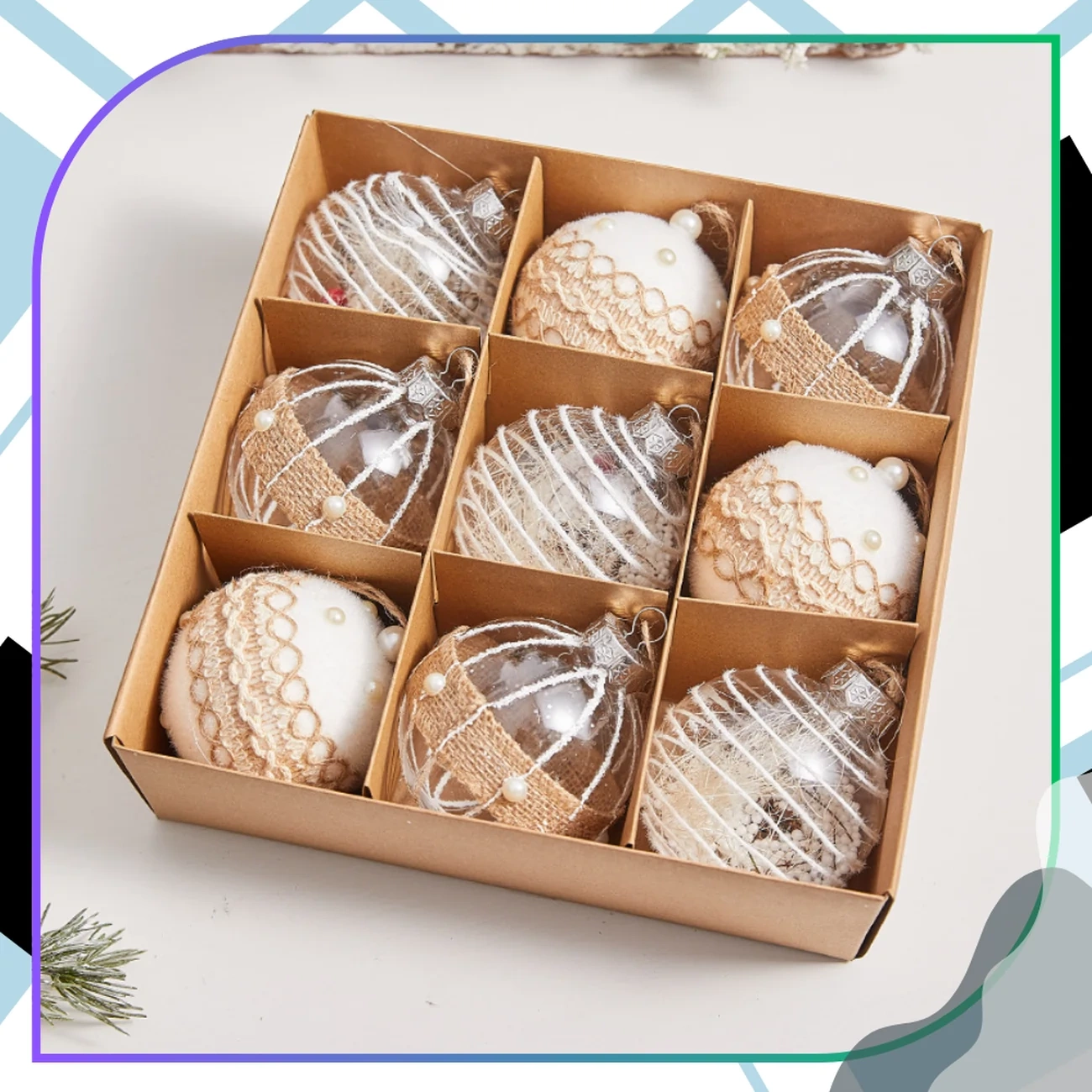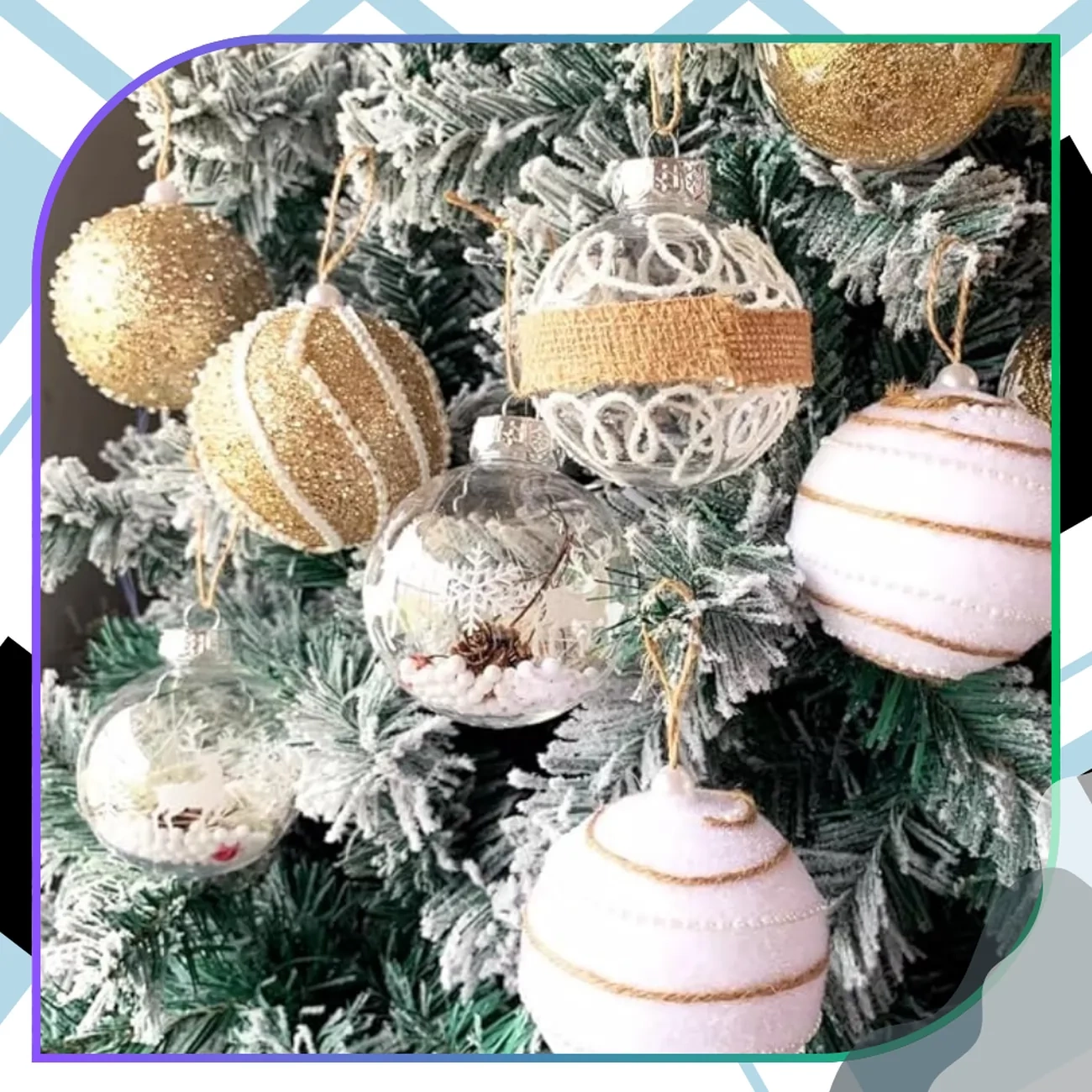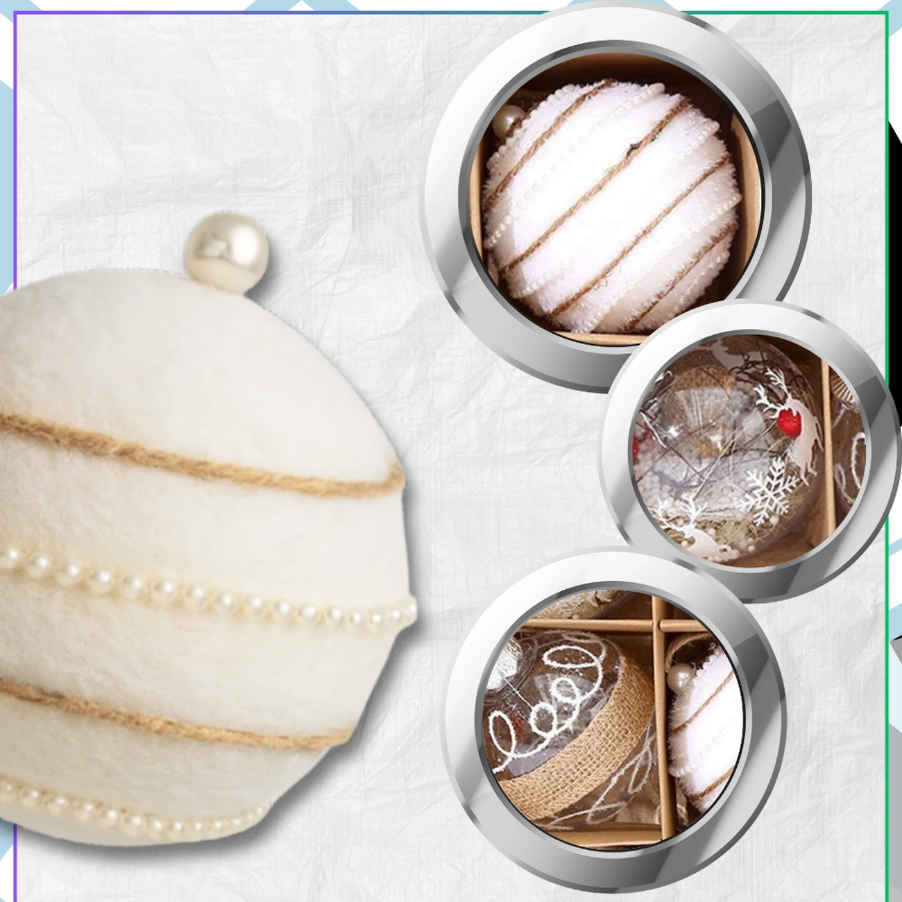 Globurile sunt transparente, decorate cu motive reni, fulgi de zăpadă, sfoară naturală de iută și accente delicate în alb și roșu. Combinația lor creează o compoziție coezivă, caldă și confortabilă, perfectă atât pentru aranjamente tradiționale, cât și pentru cele moderne. Interiorul fiecărui glob este umplut cu mici decorațiuni care reflectă frumos lumina luminilor bradului de Crăciun.