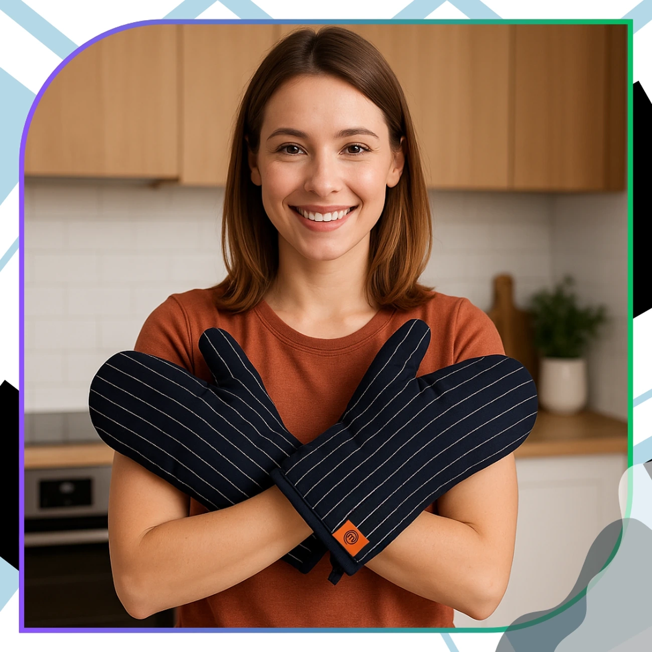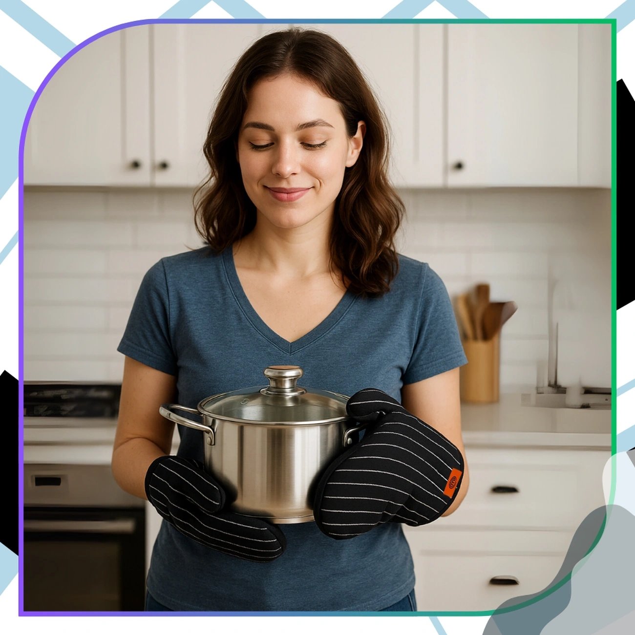 Conținutul setului – 2 mănuși de cuptor și 2 tampoane de protecție, oferind o protecție completă în bucătărie.