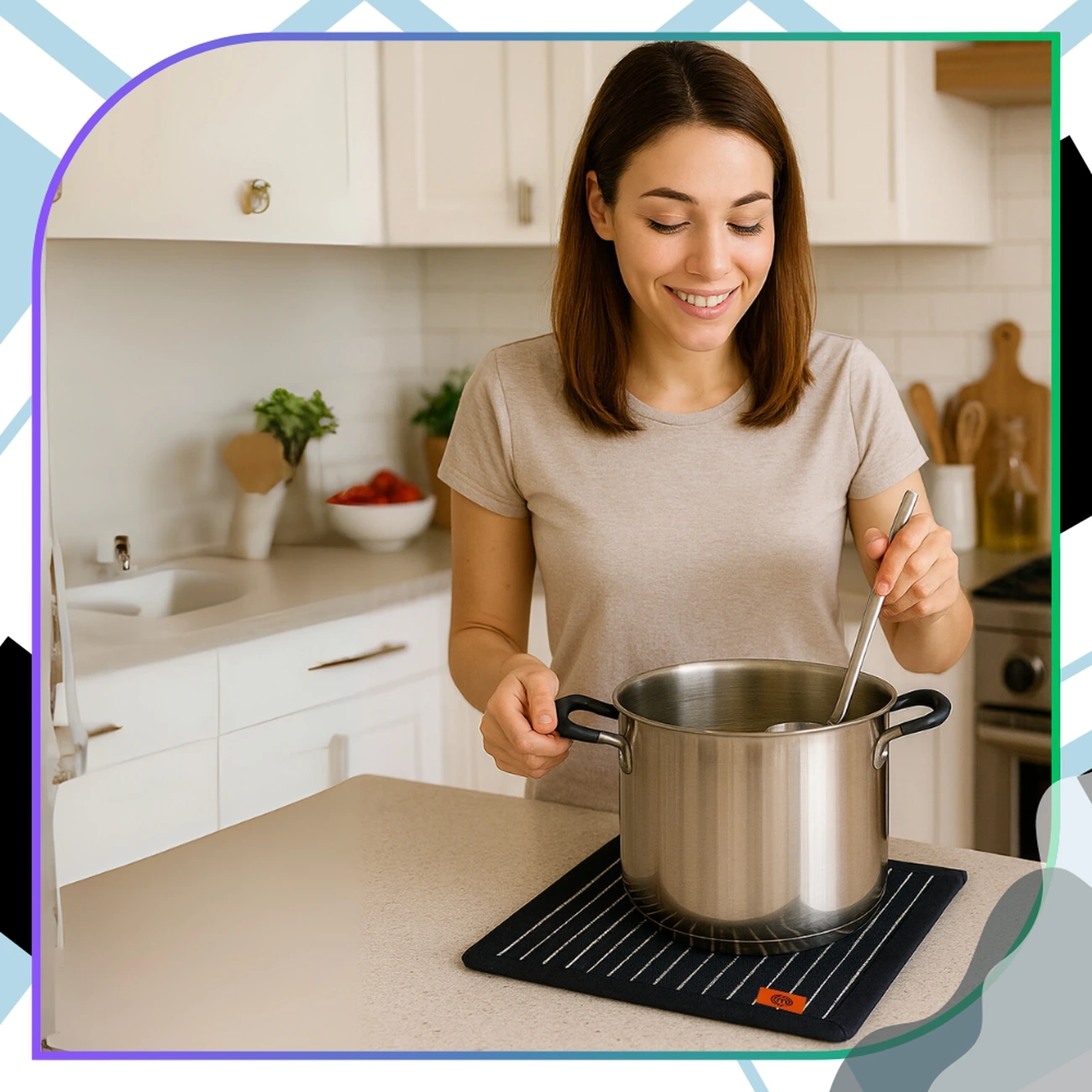 Covorașele de bucătărie MasterChef servesc drept căptușeală de protecție și suporturi stabile pentru oalele fierbinți, prevenind deteriorarea blaturilor și a meselor. Combinate cu mănuși, ele creează un set complet care ușurează gătitul, coacerea și servirea de zi cu zi. Designul lor clasic în dungi negre, inspirat de estetica MasterChef, face setul să arate grozav în orice bucătărie.