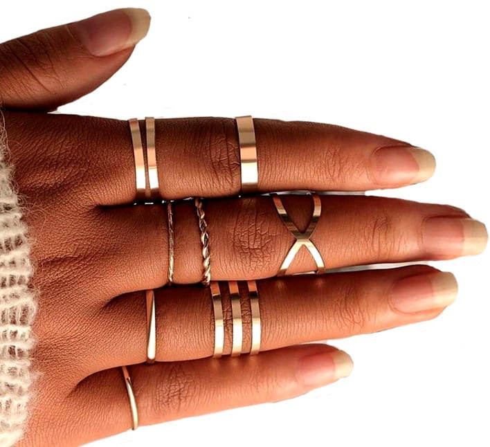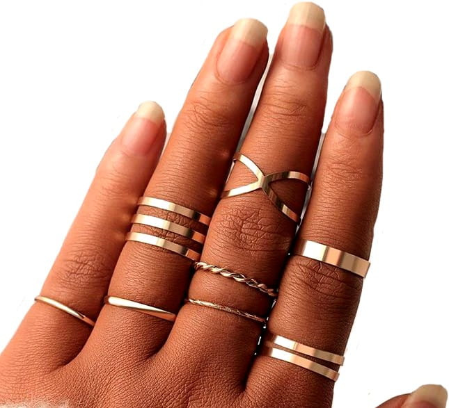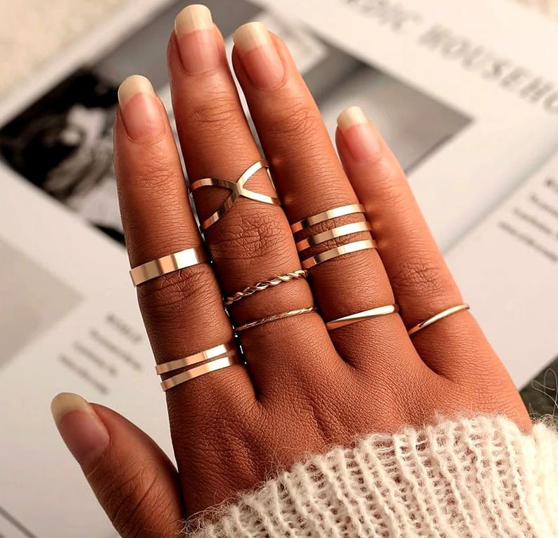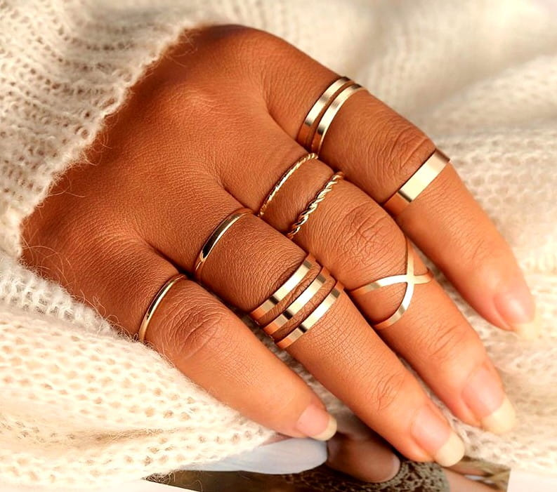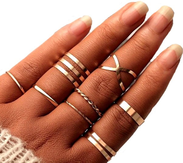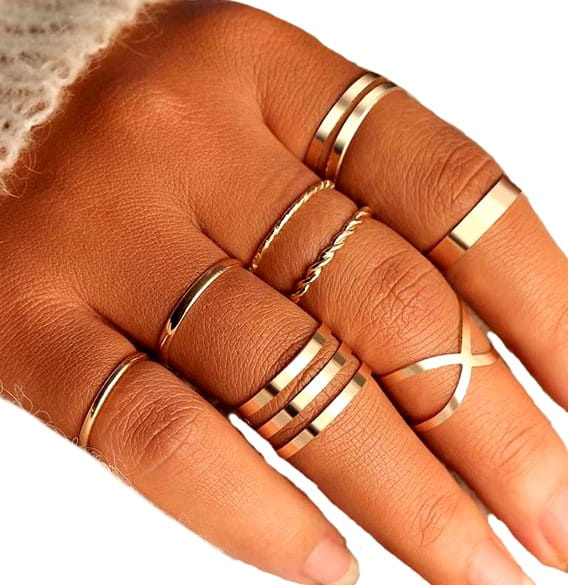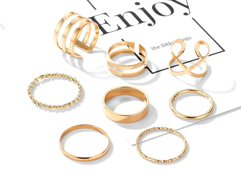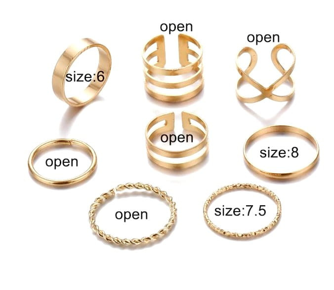 Un set de inele gotice impresionante poate fi de interes pentru multe cliente care vizitează magazinul nostru online. Este un set original, format din 8 inele cu un diametru de la 16 la 18 mm. Acest produs a fost realizat din metal pentru bijuterii, în culoarea aurului antic. Este un set de inele gotice care pot fi purtate pe orice deget.