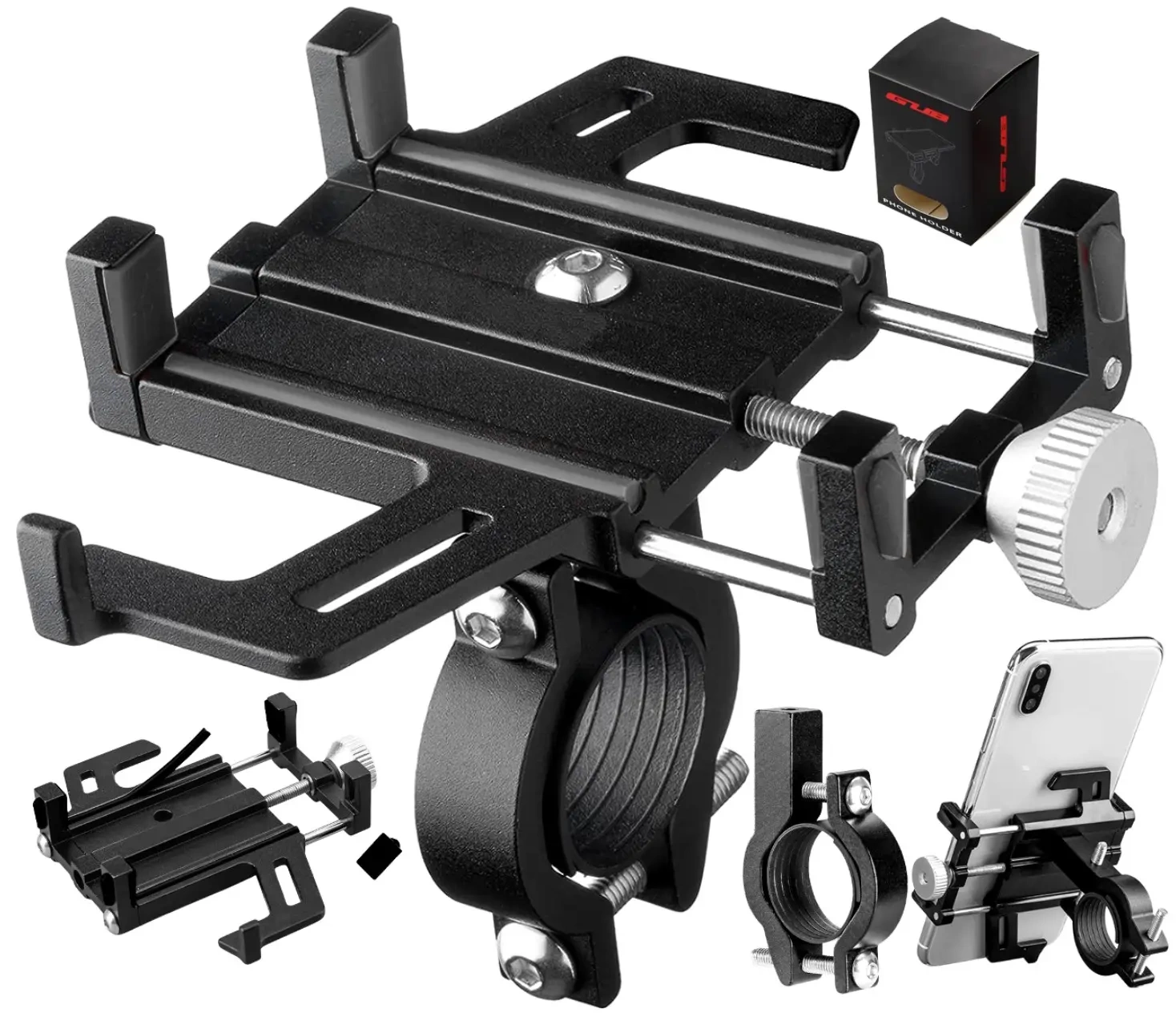 Construcția metalică este concepută pentru a se potrivi cu majoritatea modelelor de smartphone-uri. Benzile de cauciuc de la capetele elementelor de prindere protejează carcasa telefonului de zgârieturi.