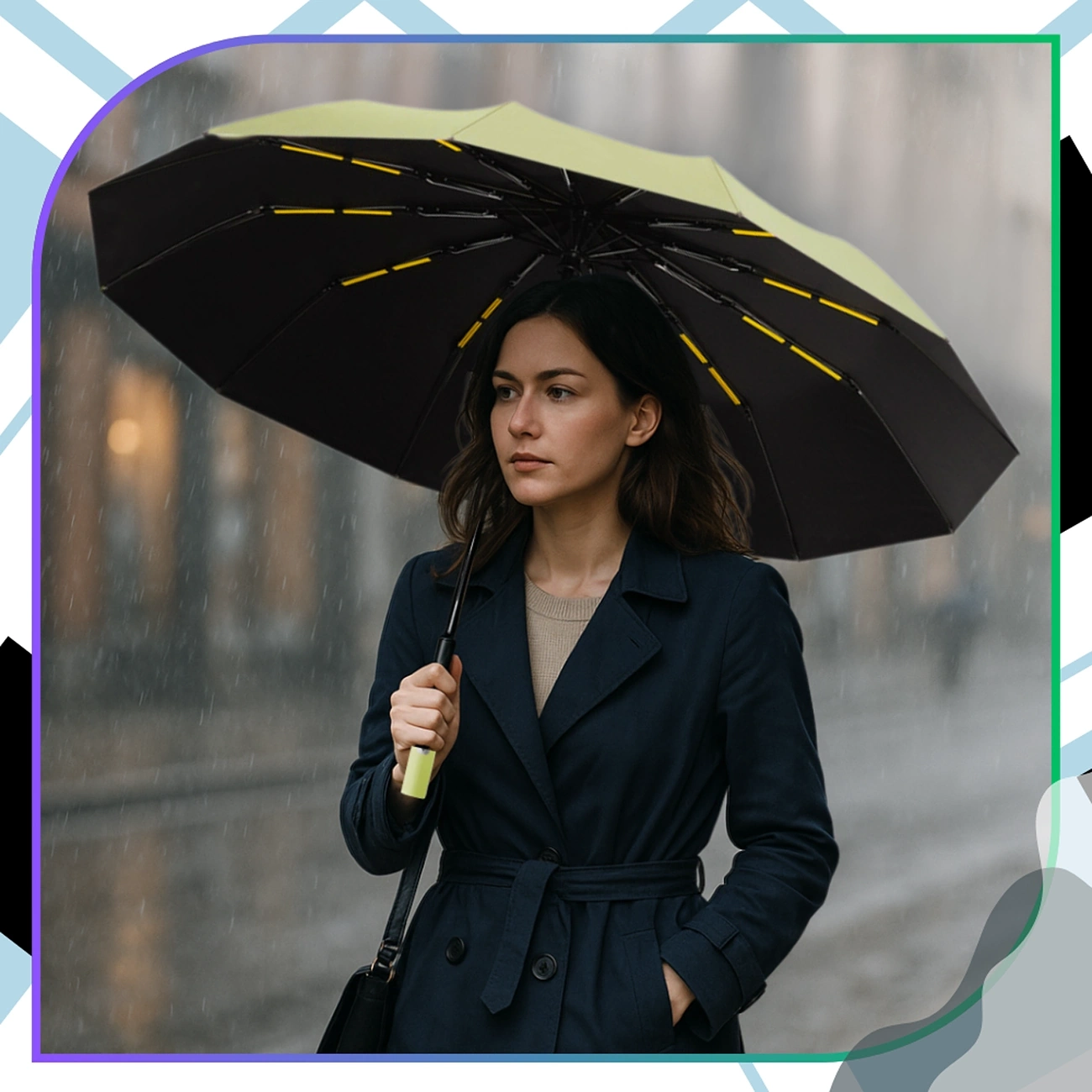 Noua umbrelă pliabilă elegantă – o umbrelă verde cu interior negru și detalii portocalii este o combinație perfectă de stil, durabilitate și funcționalitate modernă. Această umbrelă automată unică a fost concepută pentru a rezista oricărei condiții meteorologice – de la ploaie abundentă la vânturi puternice, asigurând un confort maxim în utilizare.